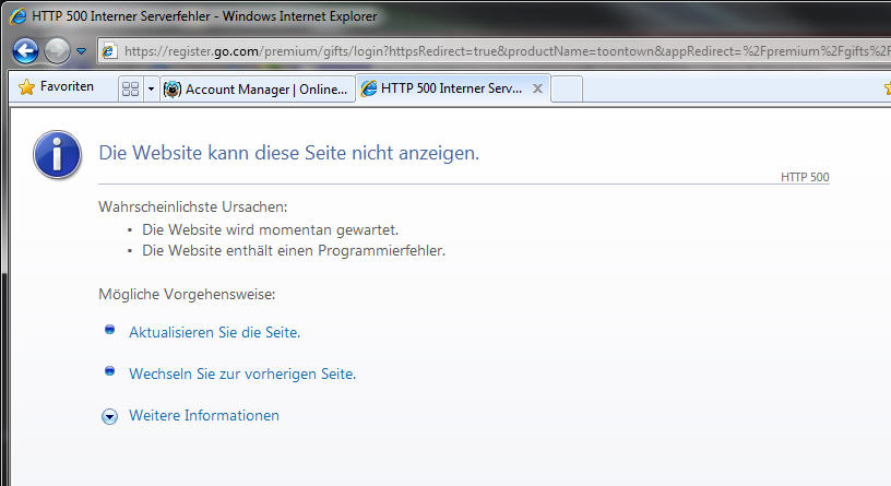 1.Neuinstallation von deinem Browser. 2.Router neutstarten 3.Toontown Email schreiben oder Anrufen. 4.Evtl.Nochmal versuchen. Ja du musst dich nicht mehr registrieren du bist ja schon mitglied in Toontown. Hoffe dir hat das was geholfen lg,heiko sry aba ich hhab alles probiert aba auf der seite sethet nach dem ich mich einlogge bei der code übergabe zum premium ERREOR 500 |
