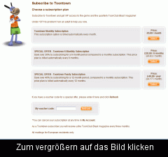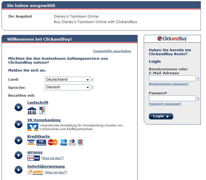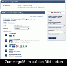Bei mir steht bei den Zahlungsmöglichkeiten nur: Visa Master Card American Express Paypal Incomm Was ist davon Click & Buy ?! Du bist sicherlich auf toontown.com ClickandBuy gibt es bei toontown.co.uk ! -------------------- |